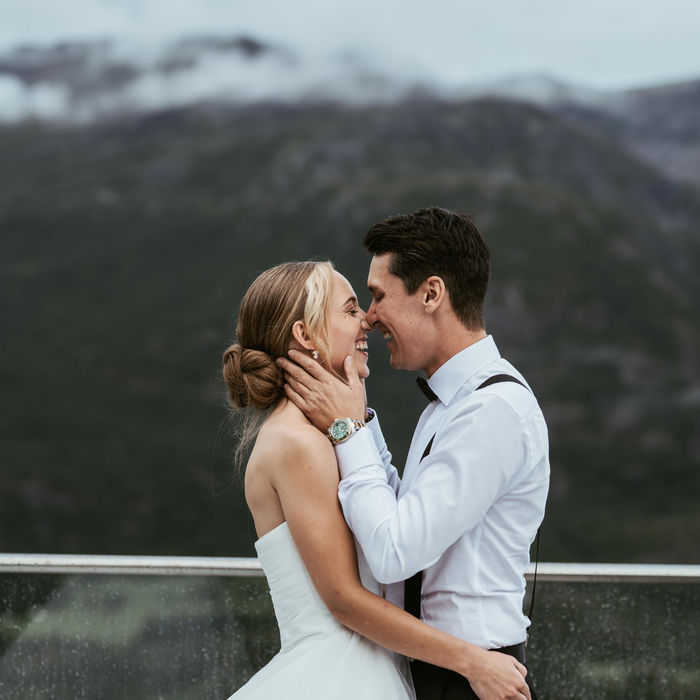 Saying "I do" in the breathtaking embrace of towering mountains, capturing the grandeur of nature in every frame.